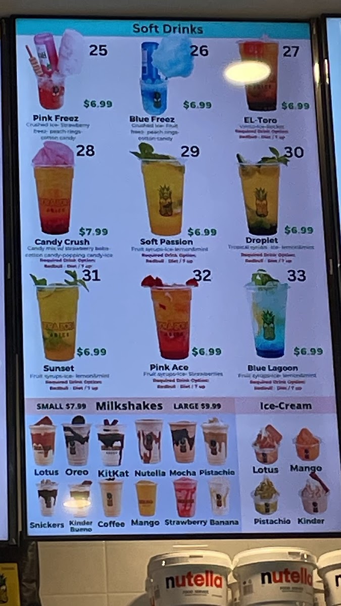 Vanilla ice cream w/ Strawberry syrup Orange & Peach ice base Rocket ice w/ Peach rings